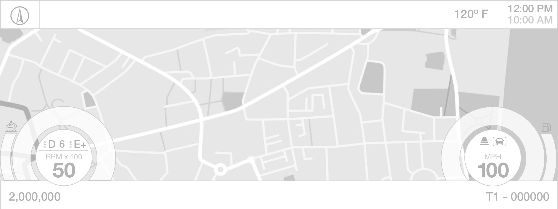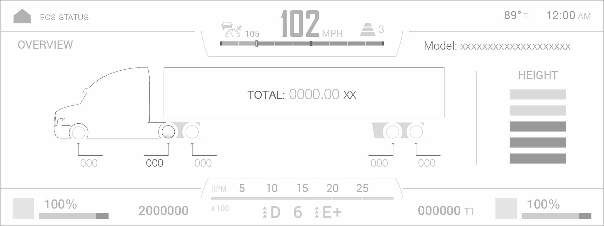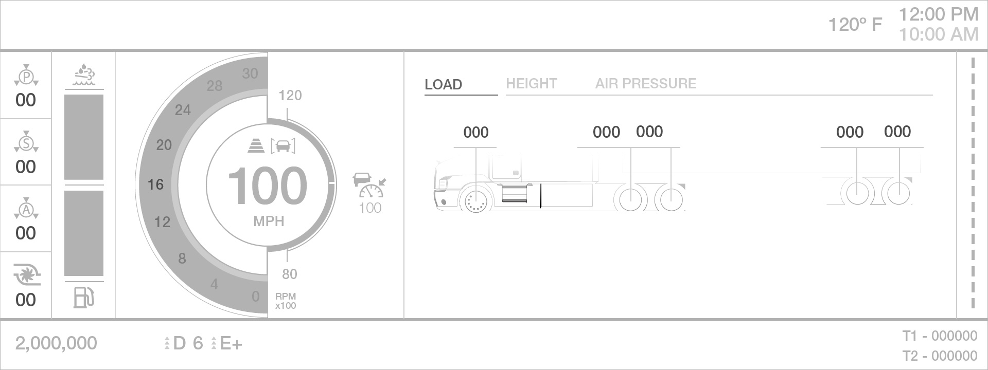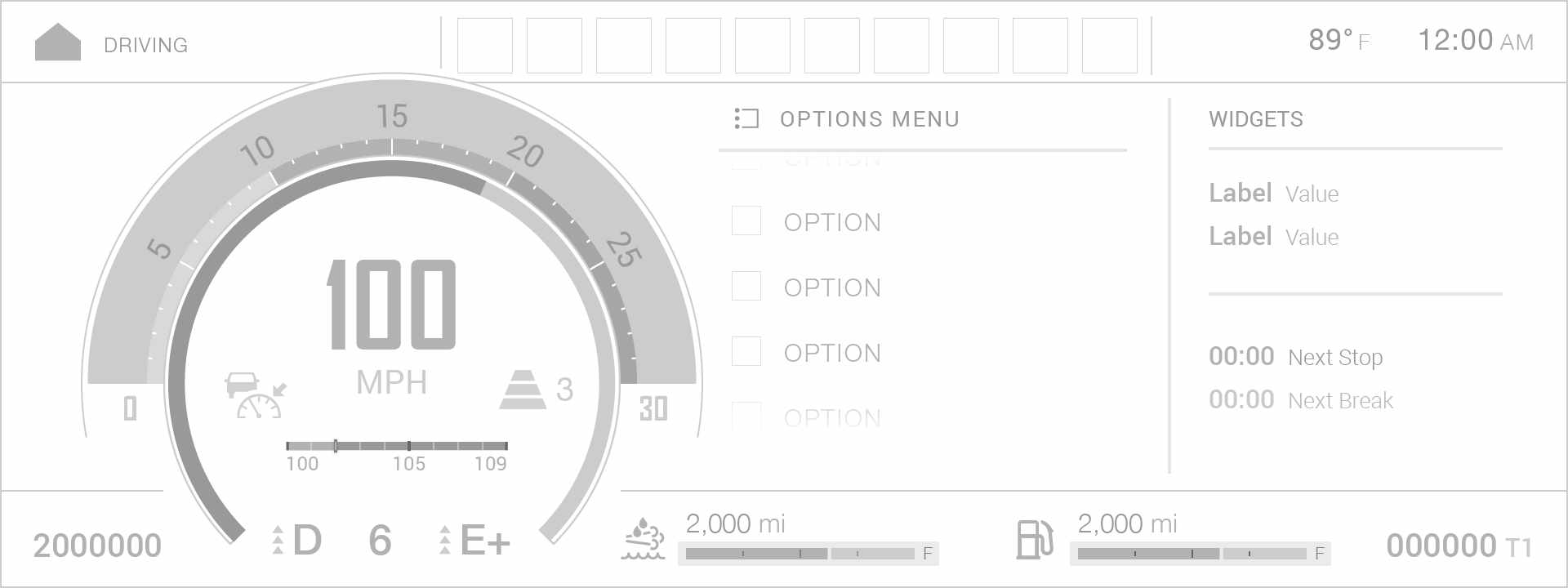 Below is an example of the numerous screens and variations created for the display. This design process extended over a more prolonged period than previous projects, emphasizing the need for precision in the initial release. While over-the-air software updates were integrated, the design prioritized inherent safety in the first iteration. Recognizing the unique context of the trucking industry, updates were planned to be less frequent and more measured compared to typical interfaces, ensuring a steadfast commitment to safety.