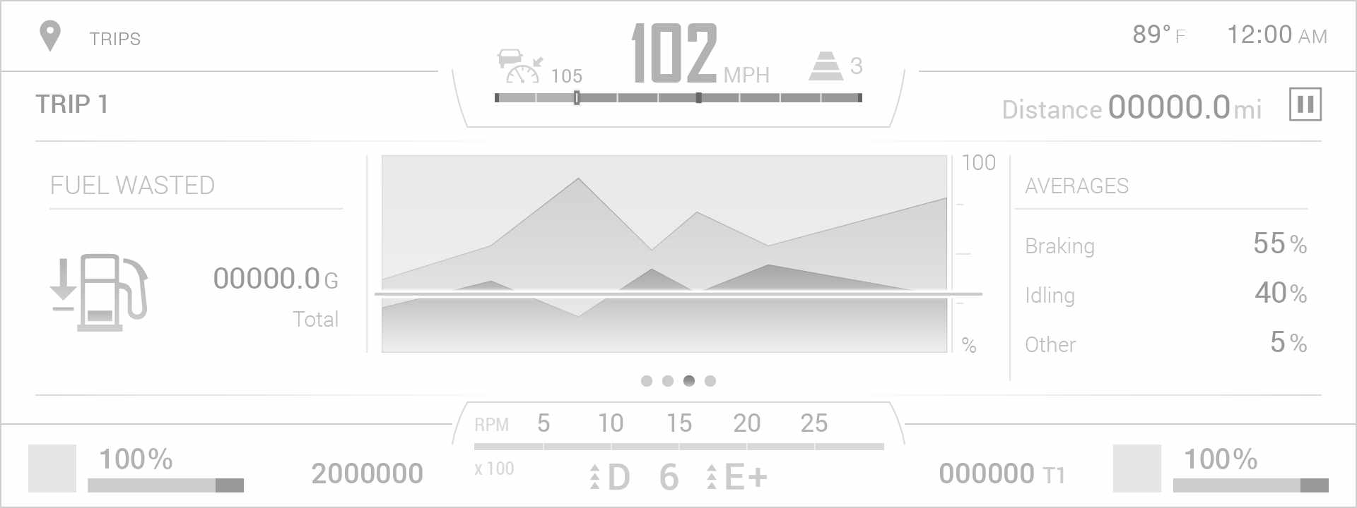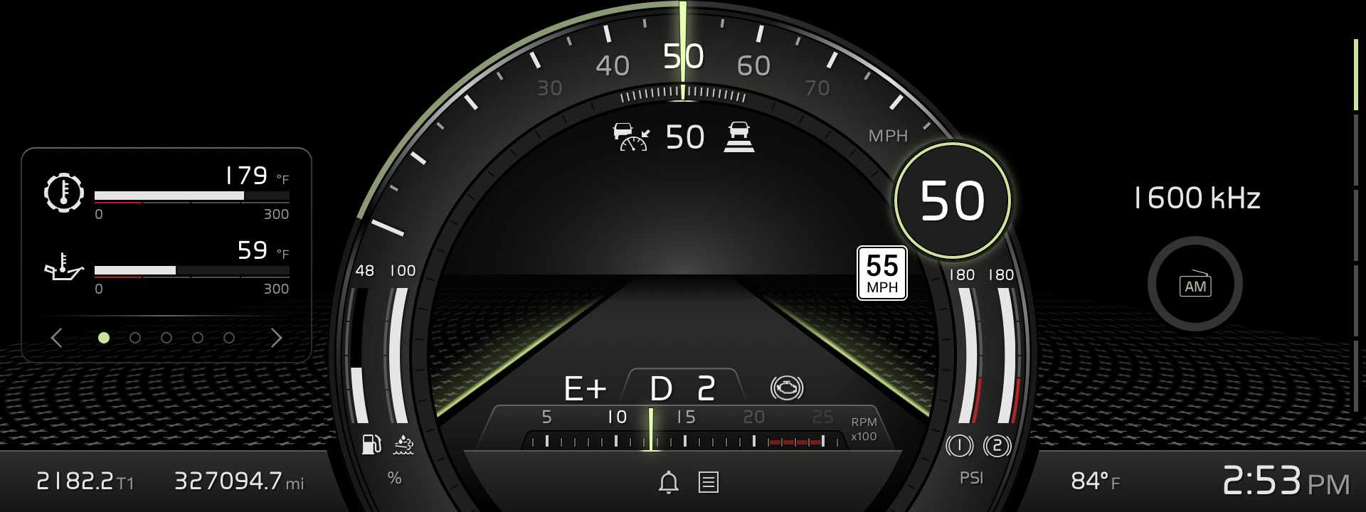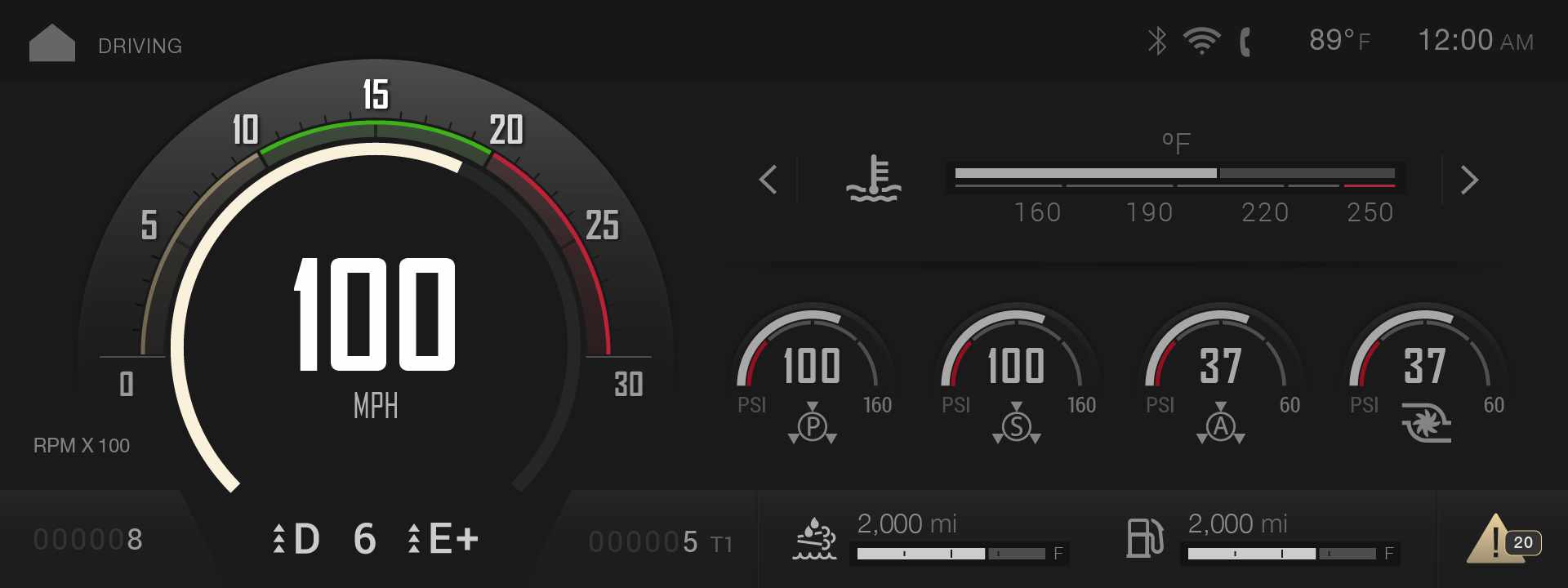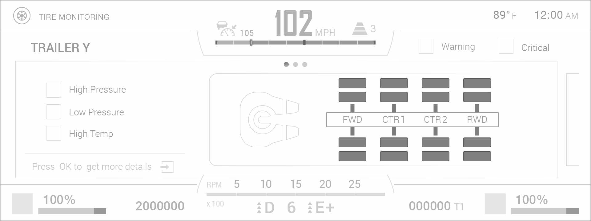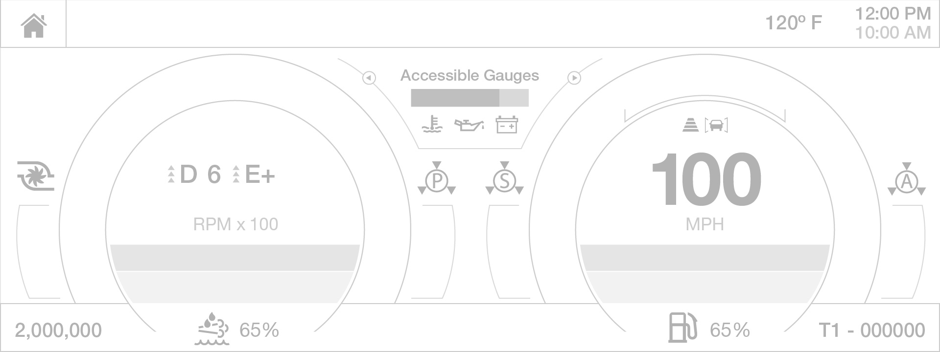 Below is an example of the numerous screens and variations created for the display. This design process extended over a more prolonged period than previous projects, emphasizing the need for precision in the initial release. While over-the-air software updates were integrated, the design prioritized inherent safety in the first iteration. Recognizing the unique context of the trucking industry, updates were planned to be less frequent and more measured compared to typical interfaces, ensuring a steadfast commitment to safety.