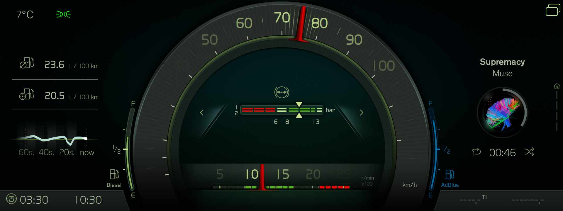 Each screen in the interface underwent meticulous consideration, encompassing critical elements such as the tire pressure monitor, navigation, and fuel efficiency, among others. The overarching goal was to ensure a seamless transition from the old analog system while offering drivers enhanced capabilities through the digital interface. The design prioritized comprehensive coverage of essential functionalities to guarantee that drivers not only retained familiar features but also gained significant additional capabilities, contributing to an advanced and intuitive user experience.